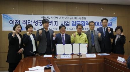 이천시(시장 조병돈)와 사단법인 한국고용서비스진흥원은 취업을 희망하는 구직자들의 성공적인 취업을 지원하기 위한 '취업성공패키지 사업 지원 협약'을 지난 17일 체결했다.